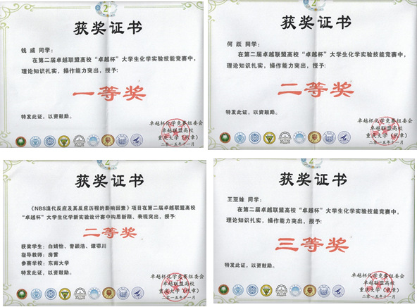 公司钱威同学在实验技能竞赛中获得实验组一等奖(赛事总共只设5名一等奖),何跃同学获得实验组二等奖,王亚妹同学获得实验组三等奖!白婧怡、曾颖浩、谭鄂川三位同学(指导老师:房雷)获得化学新实验设计竞赛二等奖!