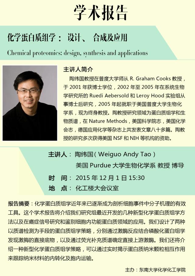 在普度大学师从R. Graham Cooks教授于2001年获博士学位,2002年至2005年在系统生物学研究所的Ruedi Aebersold和Leroy Hood实验组从事博士后研究,2005年起就职于美国普度老员工物化学系,现为终身教授。陶教授研究领域为蛋白质组学和生物质谱,在Nature Methods,美国科公司志,美国化学会志,德国应用化学等杂志上共发表文章八十多篇。陶教授的研究多次获得美国NSF和NIH等机构的资助。