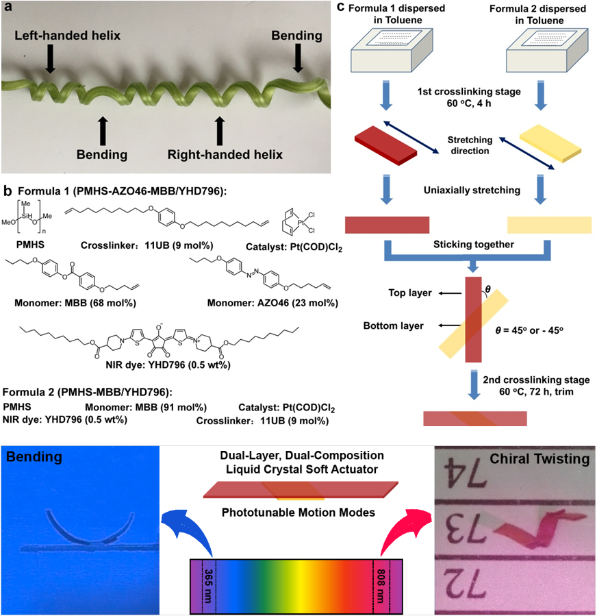 科研团队利用偶氮苯顺—反异构效应和光热转换效应,设计了一种双层、双配方的液晶弹性体材料,巧妙地解决了这一科学难题。如图b-c所示,上层弹性体材料体系中含有偶氮苯液晶基元和近红外有机小分子染料YHD796,而下层材料体系中却不含有偶氮苯液晶基元。在紫外光照条件下,整个材料只有上层做出弯曲响应,而下层无响应性,所以宏观材料产生弯曲形变;而在近红外光刺激条件下,上下两层都会产生收缩运动,因为两层的分子取向角度不同,导致宏观材料产生左旋或右旋的卷曲。