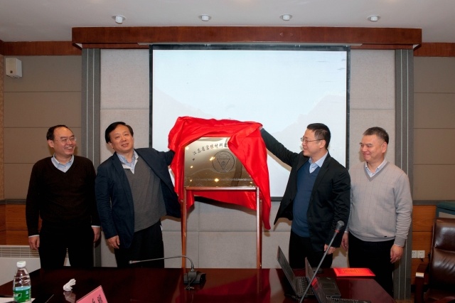 图为吴刚副董事长、江雷院士、孙岳明教授、刘松琴教授共同为江苏省富碳材料与器件工程实验室揭牌