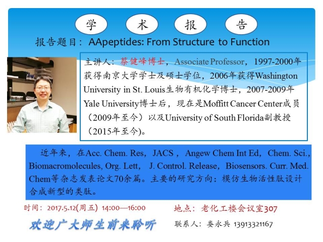 近年来,在Acc. Chem. Res,JACS ,Angew Chem Int Ed,Chem. Sci.,Biomacromolecules, Org. Lett, J. Control. Release,Biosensors. Curr. Med. Chem等杂志发表论文70余篇。主要的研究方向:模仿生物活性肽设计合成新型的类肽。