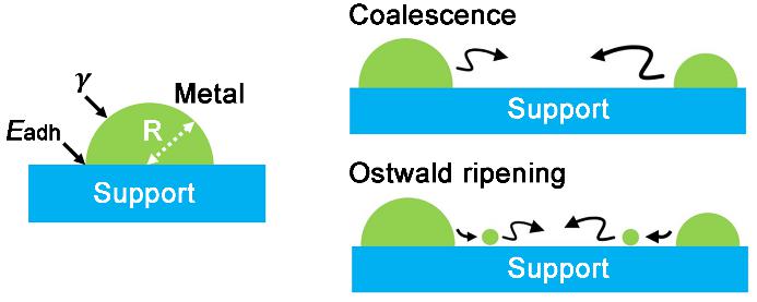 一系列重要的异相催化反应(例如CO氧化、汽车尾气净化等)常在高温(>300 °C)进行,热应力引起高催化活性、高分散的金属纳米颗粒长大、表面积下降,发生烧结。金属纳米颗粒的烧结导致催化活性和选择性急剧下降、甚至失活,极大地降低金属原子利用率的经济性。如何有效减缓负载型金属纳米颗粒的烧结、提高催化剂热稳定性,一直是能源转化、环境催化中迫切需要解决的难题。