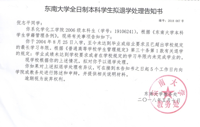 附件:《关于拟对倪志平同学作出退学处理的告知书》