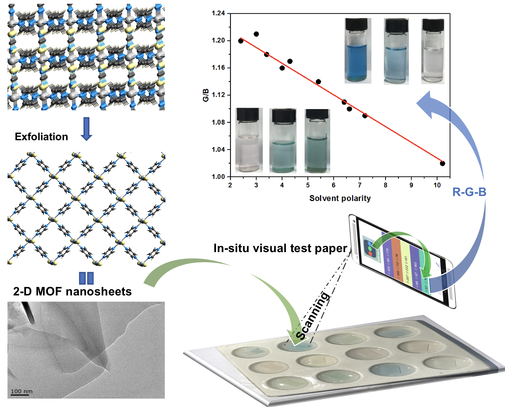 近年来,除石墨烯以外的超薄二维纳米材料的研究引起了极大的关注。其中,二维MOF纳米材料由于其可调的结构和功能、高度有序的孔洞排列、及全方位暴露的活性位点,在探测、催化、吸附/分离等方面显示了巨大的应用潜力。本研究通过溶剂辅助的超声剥离技术,成功制备了单层二维纳米片[Co(CNS)2 (pyz)2]n (pyz = pyrazine),在此基础上,开发了基于超薄二维纳米材料的检测试纸,借助智能手机的览色APP扫描技术,实现了一种便携式、原位可视化检测策略。 这一策略在爆炸物探测、有毒分子检测、分子探针,反应过程追踪等方面显示了巨大的实际应用潜力。