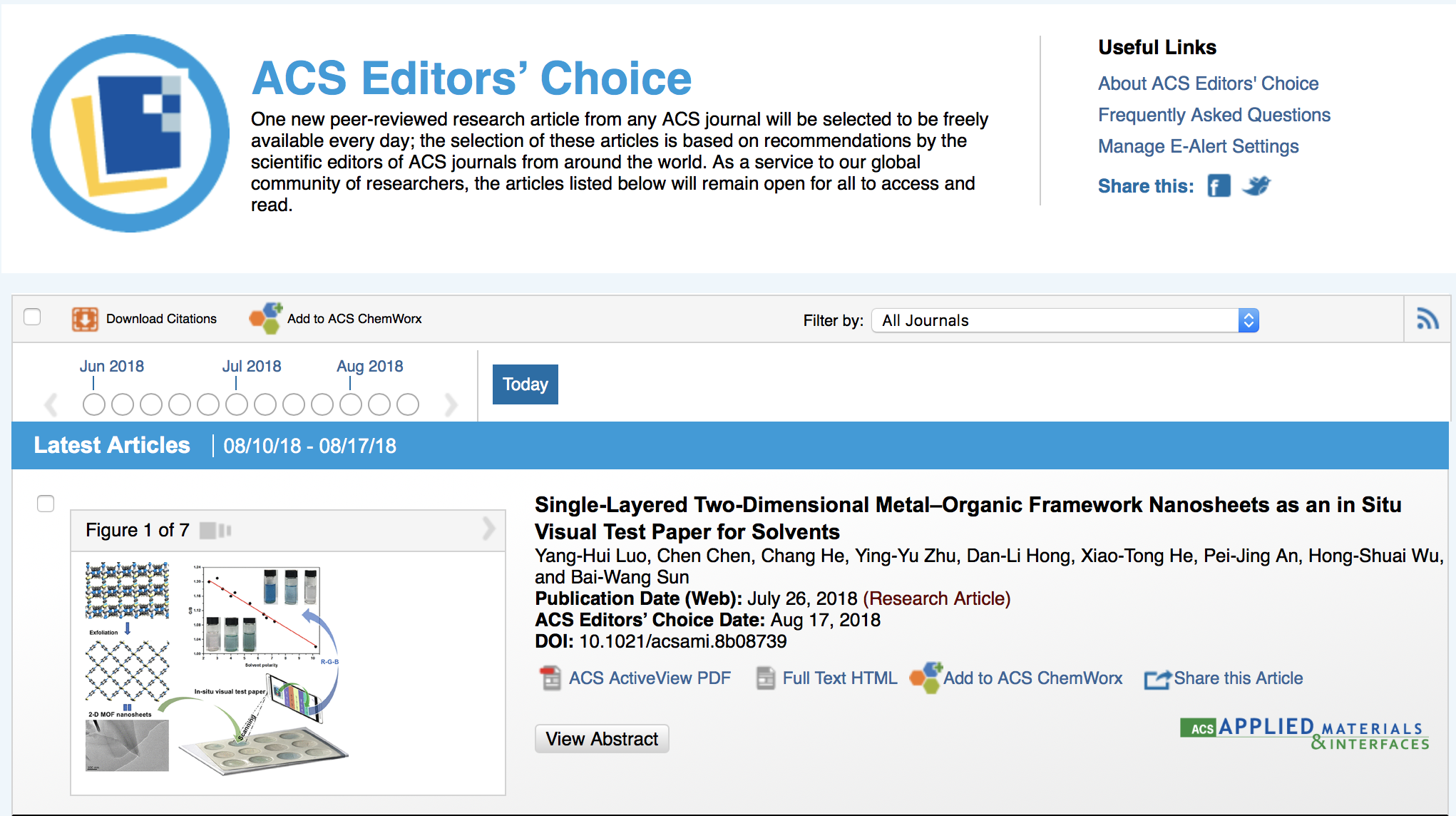 (ACS Editors’ Choice是美国化学学会(ACS)于2014年1月1日推出的一项扩大刊物影响力的举措。该服务每天从ACS开办的44种订阅期刊中选取一篇具有重大科学意义优秀的论文,经过400多名ACS期刊编辑的提名推荐,成为永久免费浏览资源。ACS Editors’ Choice的文章发放到ACS的首页上,以图片形式滚动播放7天,相当于每天的头条。ACS旗下每个期刊推荐选定的论文必须是每个杂志所有论文中的极品佳作。《美国化学会会志》(JACS)编辑Peter J. Stang(美国科公司、美国艺术与科公司、中国科公司、匈牙利科公司四院院士)指出,理想情况下编辑推荐的每一篇文章都会包含“使该领域的固有模式发生变革的一些新观念”)