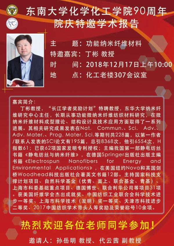 丁彬教授,“长江学者奖励计划”特聘教授,东华大学纳米纤维研究中心主任,长期从事功能微纳米纤维纺织材料研究,在微纳米纤维材料成型理论、结构设计及技术应用方面取得了一系列进展。其相关研究成果发表在Nat. Commun.Sci. Adv.Adv. Mater.Prog. Mater. Sci.等期刊共228篇,以第一作者/联系人发表的SCI论文有195篇,总引8368次,他引6554次,H指数61;已获62项国家发明专利授权;主编我国第一部静电纺丝书籍《静电纺丝与纳米纤维》,在德国Springer出版社出版主编书籍《Electrospun Nanofibers for Energy and EnvironmentalApplications》,在美国纽约Nova和英国剑桥Woodhead科技出版社合著英文书籍12部。主持国家科技支撑计划项目、自然科学基金(优青、面上、联合基金、青基)、上海市科委基础重点项目、德国博世、联合利华公司等项目31项。获美国纤维学会杰出成就奖、中国纺织工业联合会科学技术进步一等奖、上海市科学技术(发明)奖一等奖、天津市科技进步二等奖、2017中国纺织学术带头人等奖励及荣誉称号10余项。