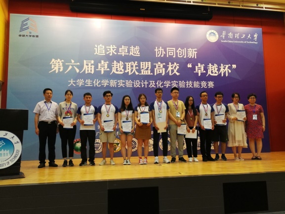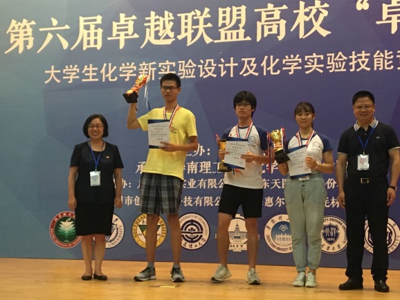 另外,实验技能赛中,赵颖丹和刘美婷分别获物理化学和有机化学三等奖。新实验设计赛中,无机及分析化学组,由王志飞和陈金喜老师指导的薛婧、肖琳、朱琼三位同学荣获二等奖;有机化学组,房雷和赵健老师指导的关贵钰、冯一鸣、刘韵怡三位同学荣获二等奖;物理化学组,郑颖平和张进老师指导的林圣球、刘巴蒂、王勐猛三位同学荣获三等奖。