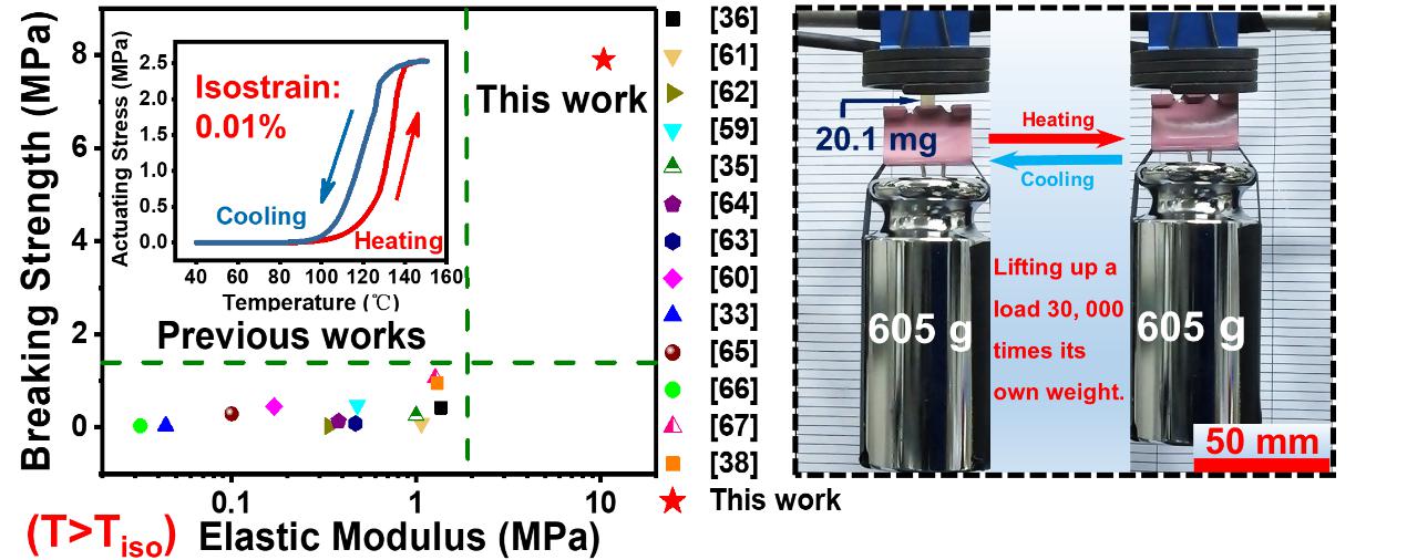 液晶弹性体是一种典型的双向形状记忆材料,具有形变大、形变可逆等技术优点,在仿生器件、软机器人等领域有很好的应用前景。然而,经过长达四十年的发展,液晶弹性体研究仍停留在实验室层面,未实现工业化应用;限制其应用的关键科学问题是:液晶弹性体在形变过程中产生的应力太小,无法满足实际应用场景的力学性能需求。例如,人的骨骼肌收缩应变大于40%,应力大于0.35 MPa,弹性模量大于10 MPa;对传统的液晶弹性体材料而言,收缩应变不是问题,应力也勉强可以达到,但是弹性模量一般在0.1~1 MPa,低了整整一到两个数量级。