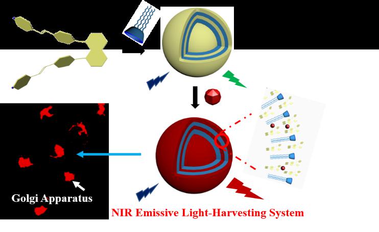 图 1. 近红外发射的人工超分子光捕获体系构筑和高尔基体选择性成像示意图