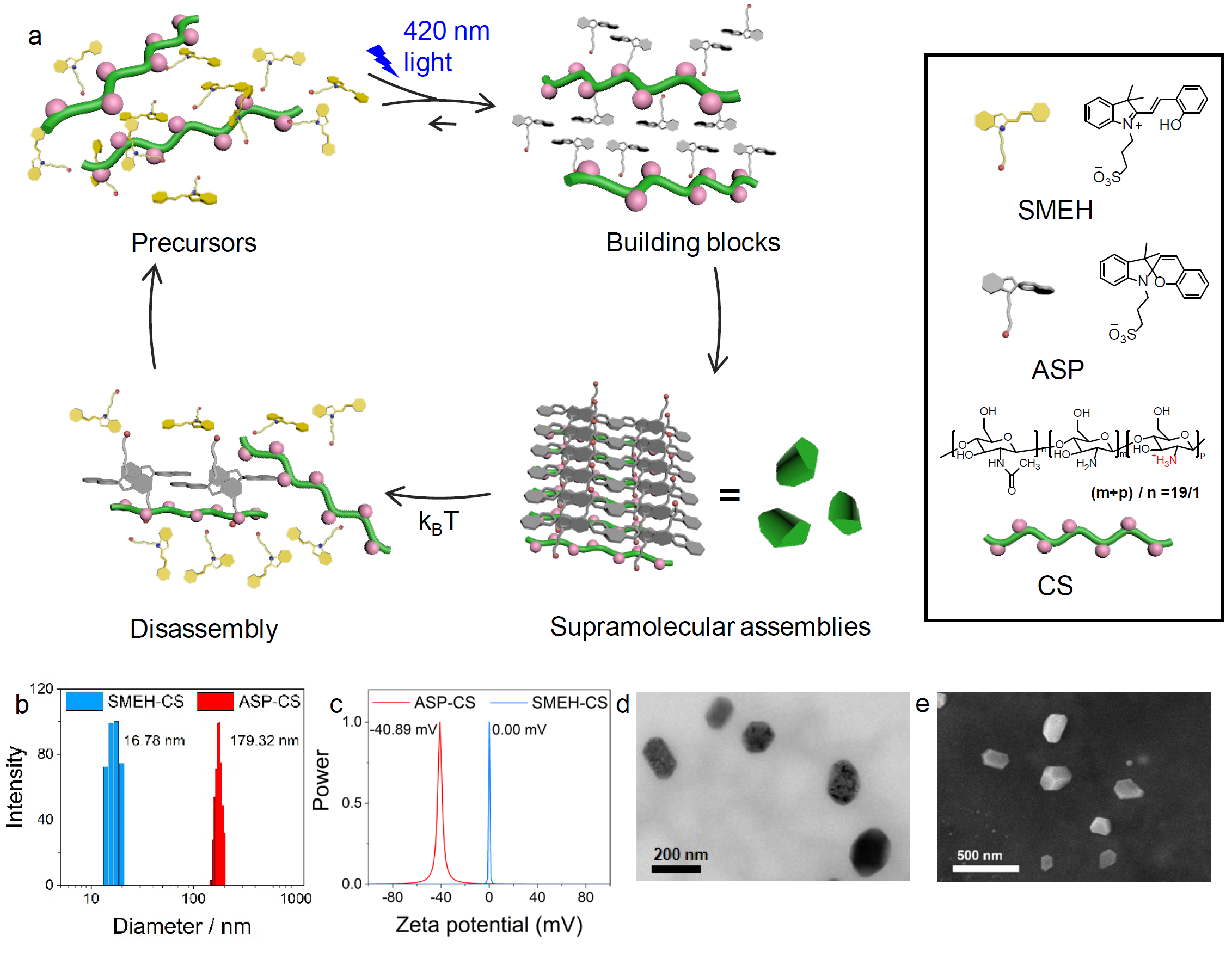 针对这些问题,该团队通过研究磺酸化部花青衍生物(SMEH)的光致异构化过程,发现其在光照条件下可转变为螺吡喃型阴离子两亲分子(ASP),而在室温下又可通过热耗散的形式逐渐恢复至SMEH的状态,据此提出该分子是一种“光诱导两亲分子”。通过将该分子与阳离子聚合物壳聚糖(CS)在水相混合,即可简便地构筑出光作为能量供给的人工超分子耗散自组装体系。由于光功率密度和温度分别对SMEH光致异构化和ASP的热耗散速率产生明显的影响,因而该耗散自组装体系的寿命可通过控制光功率密度和温度在几分钟到几小时的范围内进行调节。通过将不同发光性质(聚集诱导淬灭/聚集诱导发光)的荧光分子作为模板负载在该耗散自组装体系中,该耗散自组装体系可以实现这些荧光分子随时间变化的聚集诱导淬灭/聚集诱导发光的过程,并且发光过程变化的时间也可通过光功率密度以及温度进行调节。此外,负载了染料的该耗散组装体实现了细胞内随时间变化的动态成像功能。因此该光供能的耗散自组装体系为传感、智能发光器件等应用方面提供了可能的策略。