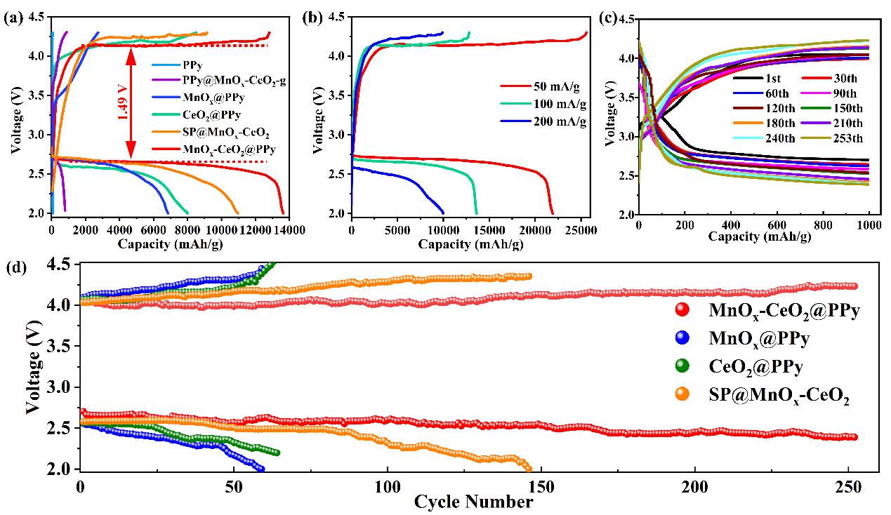 针对上述问题,课题组通过在活性物质MnOx-CeO2中空纳米球上原位聚合导电聚合物聚吡咯(PPy)纳米线,构建了具有柔性与自支撑特性的项链状MnOx-CeO2@PPy催化正极。得益于PPy优良的导电性、无粘合剂添加、活性物质与活性物质间纳米级别的紧密接触带来的界面接触电阻降低和活性物质曲面结构暴露充分的催化活性位点,MnOx-CeO2@PPy的Li-CO2电池表现出优异的放电容量(100 mA g-1时为13631 mAh g-1)、循环性能(253次循环)以及1.49 V的低过电势。特别是,该柔性自支撑正极材料也为开发柔性Li-CO2电池提供可能。此外,作者还通过密度泛函理论(DFT)计算与实验表征测试的结合来深入分析导电聚合物的导电机制、催化底物吸附能力的变化、活性表面MnOx-CeO2 (111)上优化的