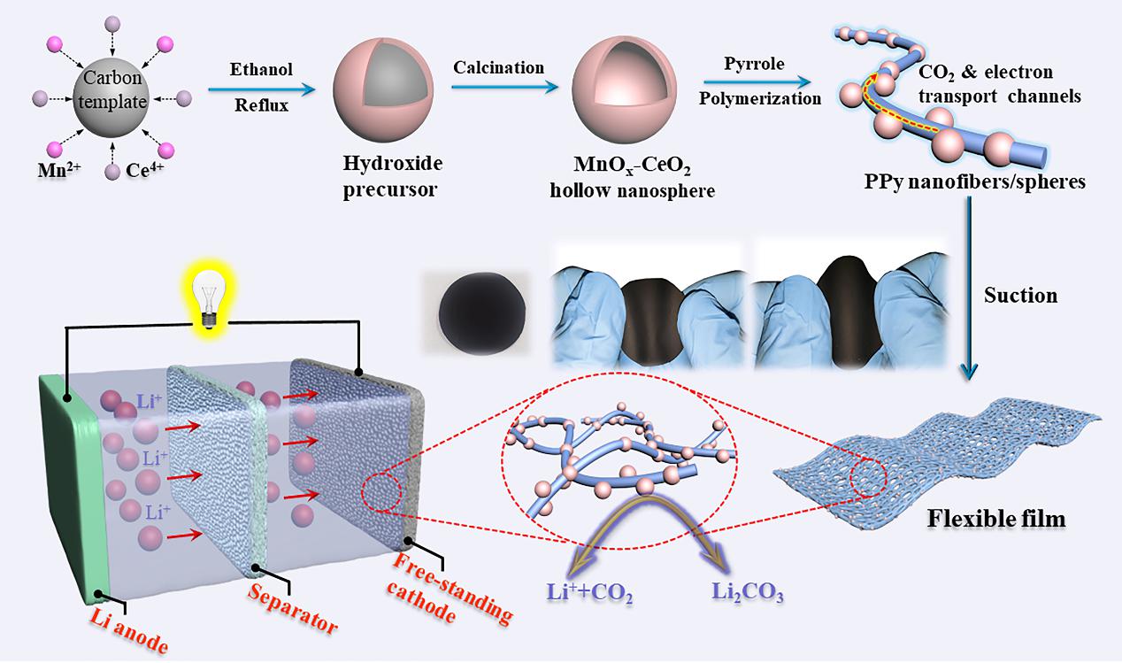 近日,太阳成城集团tyc234cc古天乐张一卫教授课题组在能源材料领域国际顶级期刊Advanced Energy Materials (影响因子29.3)发表题为“Electronic State Modulation and Reaction Pathway Regulation on Necklace-Like MnOx-CeO2@Polypyrrole Hierarchical Cathode for Advanced and Flexible Li-CO2 Batteries”的研究成果,为高效Li-CO2电池催化正极材料的开发提供了新思路。