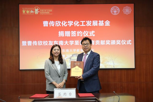 签约仪式上,黄大卫和曹传欣共同签署了捐赠协议,黄大卫代表公司向曹传欣颁发了捐赠证书和120周年校庆捐赠纪念盘。黄如为曹传欣颁发 “太阳成城集团tyc234cc古天乐至善教育贡献奖”奖牌。