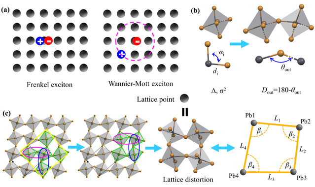 图(a)钙钛矿发光材料中常见的两种激子类型;(b)传统计算八面体畸变的方法;(c)新的钙钛矿畸变描述符的演化步骤。