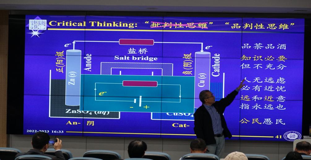 吴奇院士向与会师生介绍了普通热力学在大学化学教学中的重要地位,并结合《热力学简明教程》,向大家介绍了一些基本概念,如温度、压强、理想气体、渗透压、过热现象等,在不涉及复杂数学计算的前提下,形象生动地阐述了热力学原理及应用之间的关系,强调了基础知识在研学中的重要作用。吴奇院士强调了热力学教学过程中应当侧重热力学概念及原理讲解,注重培养员工的逻辑思维。吴院士还强调了“品判性思维”的重要性,希望大家能综合运用知识和品判性思维探索现象背后的本质,解决实际问题。长达近三个小时的报告,年逾六旬的吴奇院士自始至终站在台前完成演讲,身为“资深”的物理化学教师,他为一线教师恪尽职守、坚守初心树立了标杆。