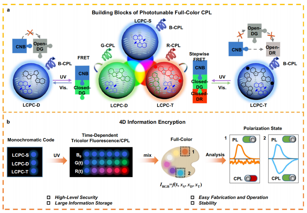 基于此,李全院士团队报道了一种具有光触发全彩色CPL的液晶光子胶囊(LCPCs)。本研究在LCPCs中构建了从手性供体(S)-CNB到非手性分子开关DG和DR的Förster共振能量转移(FRET)平台,制备了可加工性能优异、颜色高度可调固体薄膜。通过逐步FRET过程,实现了从蓝色发射到红色发射的光控变色CPL,发光波长迁移长达160 nm,FRET效率高达94.0%;实现了CPL的RGB三色信号的光转换,最大glum值可达–0.11。由于FRET效率随时间的变化,LCPCs的发光颜色表现出很强的时间依赖性。进而制备了以聚乙烯醇为基质的LCPCs薄膜,根据其光控全彩色CPL特性,展示了4D信息加密与解密的概念。使用6种LCPC薄膜制备了高安全级别的条形码,并进一步对应三组ASCⅡ二进制代码,展示出只有特定时刻和偏振状态才能解密的“高级密码本”。这种集成荧光、时间响应、全彩色发射和CPL特性的LCPC薄膜展示了在多级信息加密领域的强大潜力和广阔应用前景。
