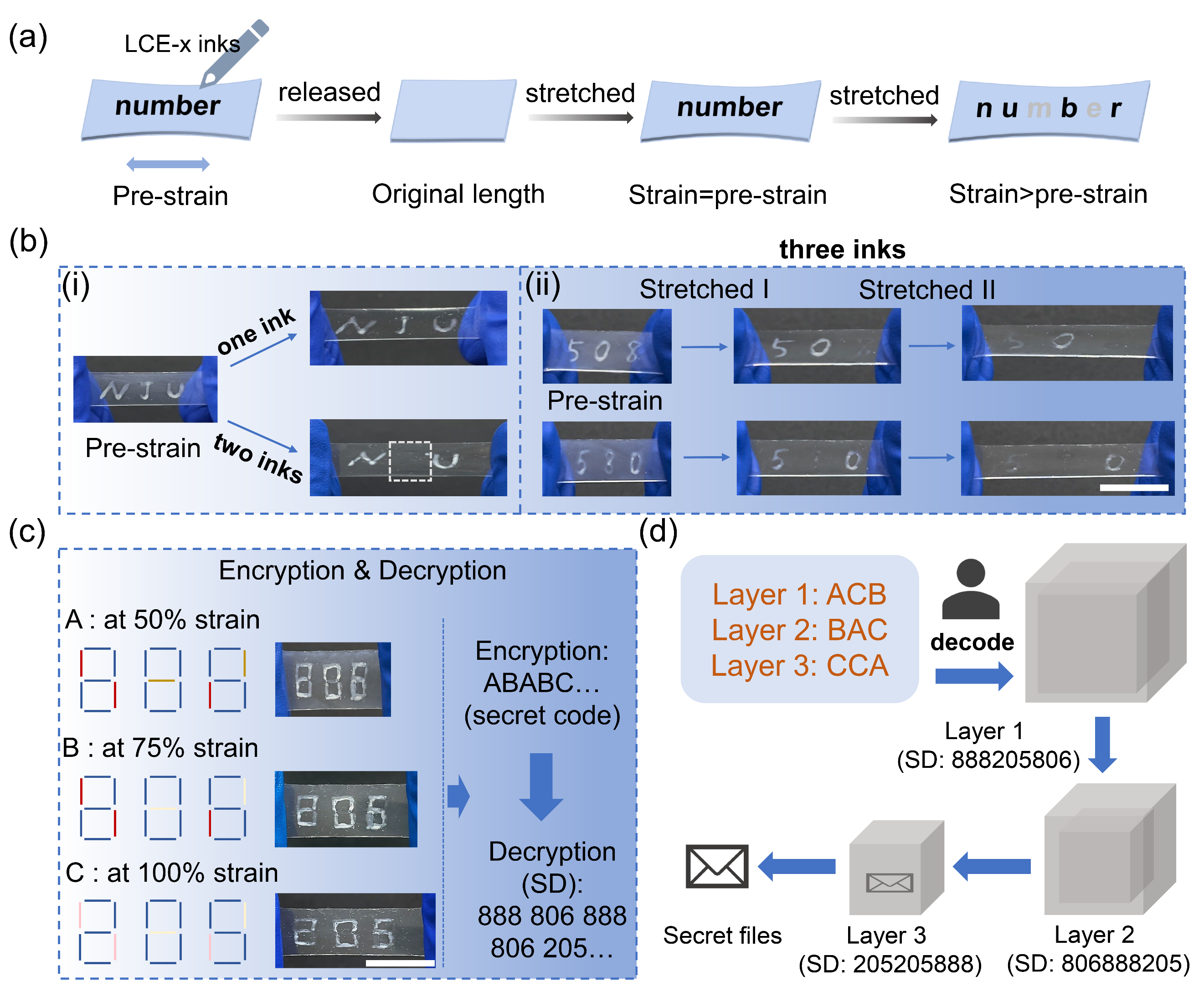 团队通过设计一系列双重响应的多畴液晶弹性体(LCEs),利用其在应变/温度的刺激下由不透明向透明状态的转变,实现了多级信息加密和实时、可重写的瞬态信息显示。当应变诱导的多畴态-单畴态或温度诱导的向列相-各向同性相相变发生时,制备的多畴LCEs样品可以实现不透明到透明状态的可逆转变,其转变应变或温度高度依赖于长链柔性间隔剂的含量。因此,利用不同LCE油墨加密的信息可以在特定的应变或温度下解密,从而实现信息的多级保护。此外,结合多畴LCEs的相变和多壁碳纳米管(MWCNTs)的光热效应,利用近红外光作为书写笔,实现了可重写的瞬态信息显示。这项工作为开发多重刺激响应材料提供了新的选择,在数据存储、加密和显示系统中具有潜在的应用前景。