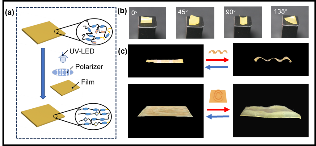 图1. 液晶弹性体的偏振紫外光编程各向异性机理及线性偏振紫外光编程后的液晶弹性体薄膜的热致动行为。