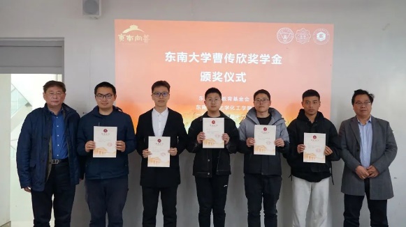 曹传欣员工和黄董事长为获奖同学颁发了奖学金证书。