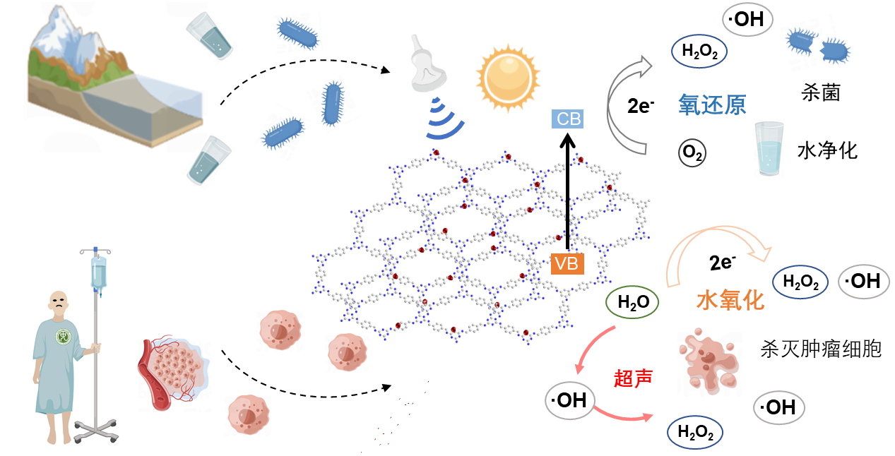 C5N2压电光催化合成H2O2用于光声肿瘤治疗及污水净化应用示意图
