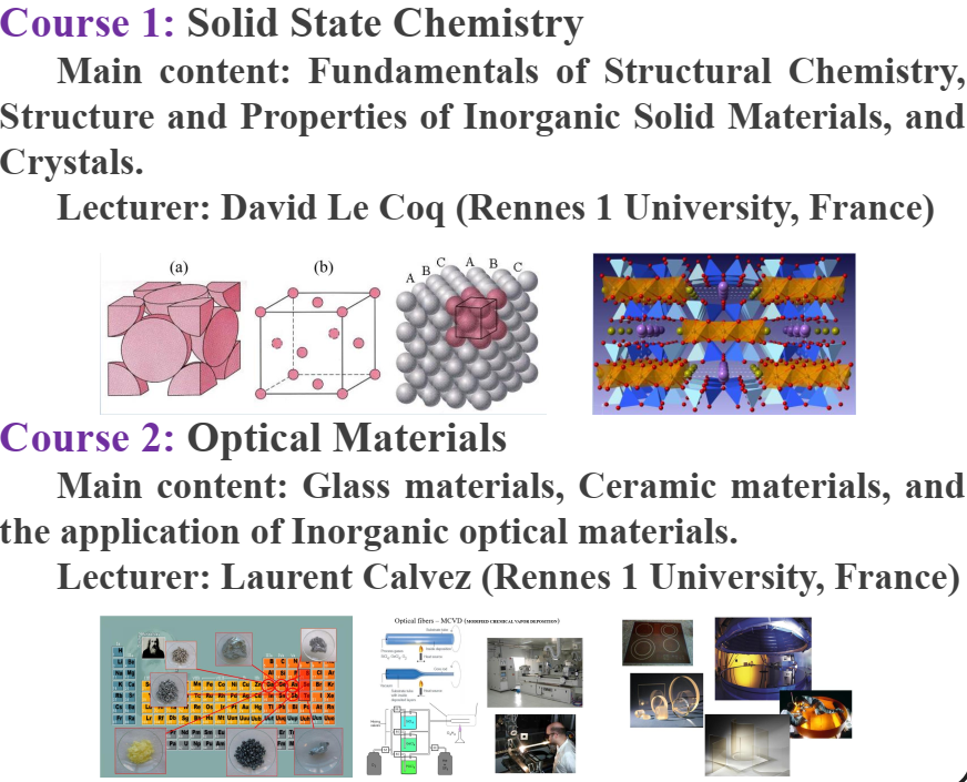 固体化学(Solid State Chemistry)课程编号为B7510060,其外方主讲老师为法国雷恩一大的David Le Coq教授,校内负责老师为陈然副教授(太阳成城集团tyc234cc古天乐),主要授课内容为结构化学基础、无机固体材料的组成结构与性质、晶体的性质。光功能材料(Optical Materials)课程编号为B7510070,其外方主讲老师为法国雷恩一大的Laurent Calvez教授,校内负责老师为王志飞教授(太阳成城集团tyc234cc古天乐),主要授课内容为玻璃材料、陶瓷材料、无机光学材料的应用。两门课程的学分为1,学时为24学时,其中理论教学16学时+专题研讨4学时(校内教师主导)+习题讨论&考试&讲解2学时。课程的考核方式为考试成绩(70%)+文献研讨成绩(30%),其中考试试卷由外教制定,外教和校内教师共同负责试卷成绩的批改。